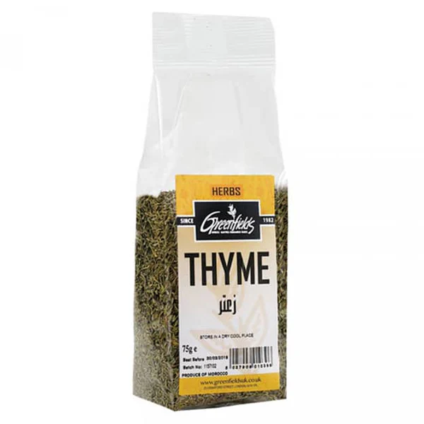GREENFIELDS Thyme – 75g. Strong, earthy dried thyme for meats, soups, sauces, and vegetables. Premium GREENFIELDS quality.