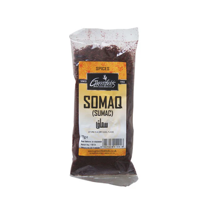 GREENFIELDS Sumac – 75g. Tangy, citrusy Middle Eastern spice for salads, kebabs, dips, and rice. Premium GREENFIELDS quality.